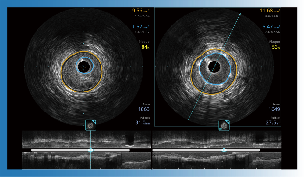 对比传统IVUS导管成像,db真人体育官网宽频IVUS图像的近场支架梁显影更细腻,远场中膜外血管仍清晰可辨,兼顾远中近,兼顾分辨力与穿透深度